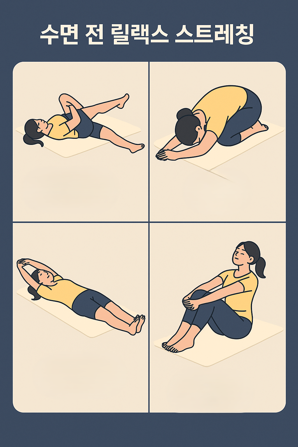 잠들기 전 간단한 스트레칭은 수면 유도와 숙면에 큰 도움을 줍니다.