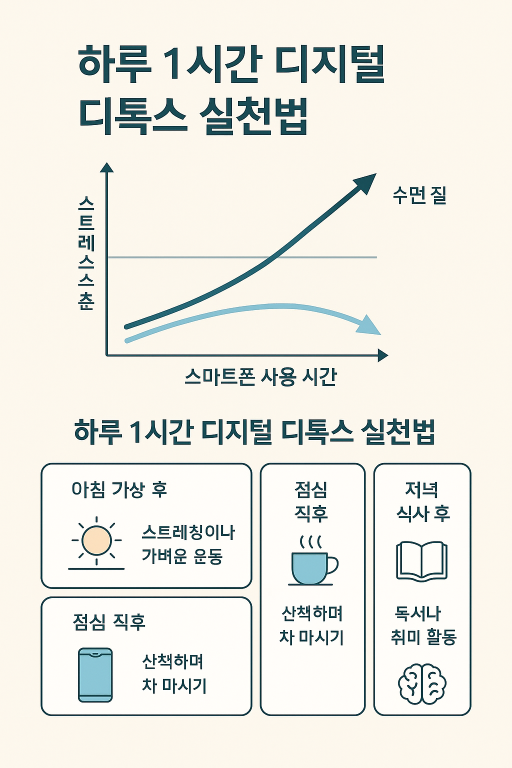 | 아침 기상 후 | 스마트폰 확인 대신 창문 열고 스트레칭 |